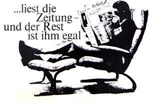 Der InseratenmetteurAlle Leute, die ihn kennen,überlegen plötzlich scharf, ob man ihn wohl Künstler nennen dürfe. Ja gewiss, man darf! Künstler ist er. Ein moderner. Seine Werke: Mosaik. Bild und Text. Er rechnet ferner dauernd und mit viel Geschick. Eine klappernde Maschine beigt ihm emsig Zahl auf Zahl und erlöst als Arbeitsbiene oft ihn aus der Qual der Wahl. Nebst Papier in hohen Stössen fallen diesen armen Mann Inserate aller Grössen ohne Unterbrechung an. Was ihm Kümmernis bereitet: Jedes zweite Inserat ist von manchem Wunsch begleitet. Dort das Wollen - hier die Tat. Ei, da bleibt man quicklebendig, bleibt man ständig auf dem Sprung, bleibt beweglich man und wendig und entsprechend frisch und jung. Was als regellose Masse kreuz und quer umhermarschiert, wird im Nu mit Schwung und Rasse in die Seiten manövriert. Und der Mann, der hier das Zepter führt und keine Mühe scheut, ist vergnügt (und davon lebt er), wenn sich auch der Kunde freut. Doch der Mann mit langer Leitung hält das alles für normal. Vater Bircher liest die Zeitung - und der Rest ist ihm egal. |