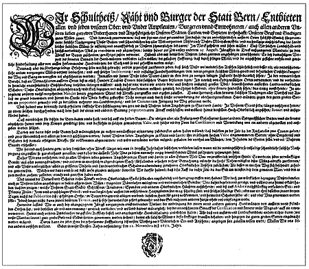 an den vier Landstrassen vor Bern ausgestellt. Christian Schybi, Luzerner Bauernführer, von Escholzmatt Johann Konrad Brenner, Notar in Münsingen, aus der Markgrafschaft Baden stammend Hans Emmenegger, Pannerherr des Entlebuchs Emanuel Sägesser, Schulmeister zu Aarwangen Samuel Tribolet, Landvogt zu Trachselwald, hart, geldsüchtig und verhasst: "dem hochmüetigen und gäldgierigen Samuel Tribolet von Bern: Tribolet du toller Gast, aller Bauren Überlast, ohne Ruehm und Lob du bist, Tribolet du schnöder Christ." 22. November 1652: Batzenabruf, Herabsetzung des Berner Batzens um die Hälfte. 13./23. April 1653: Bauernlandsgemeinde zu Sumiswald; Leuenberger wird Obmann des Bundes, Emmenegger wird Generaloberst. 4./14. Mai 1653: Bundesschwur zu Huttwil von Bauern aus den Untertanengebieten von Bern, Luzern, Solothurn und Basel. 10./20 Mai 1653: Beginn des Krieges, die Bauern ziehen vor Bern 18./28. Mai 1653: Murifeld-Vertrag zwischen den Bauern und der Stadt Bern - wird von der Stadt nicht innegehalten. Die Bauern gehen nach Hause, die von der Stadt aufgebotenen welschen Truppen marschieren ein. Die Zürcher rücken gegen den Aargau vor. 24. Mai/3. Juni 1653: Gefecht bei Wohlenschwil mit dem reformierten Tagsatzungsheer 25. Mai/4. Juni 1653: Der Vertrag von Mellingen bestätigt die Niederlage der Bauern; das Bauernheer löst sich auf - der Vertrag wird von den Städten nicht eingehalten. 29. Mai/ 7. Juni 1653: Letztes Gefecht bei Herzogenbuchsee; Bern siegt mit seinen treuen Waadtländern. "Wyl sy zu Herzogenbuchsi von 2000 Mann Widerstand und viel Trotzens gefunden, haben sy selbiges Dorf in Äschen gelegt und by siebzig Firsten mit Brand zugrunde gerichtet." 6./16. September 1653: Leuenberger wird in Bern geköpft und geviertelt. 25. Oktober 1653: Ueli Galli, "Der Rebell von Eggiwil", "Hauptursächer des Bauernaufstandes", stirbt als einziger den entehrenden Tod am Galgen. Zur Chronologie: Die katholischen Kantone hatten bereits den Gregorianischen Kalender angenommen, während die reformierten noch am Julianischen festhielten, der 10 Tage nachging. (Die Daten und Namen sind nicht in allen Darstellungen gleich.) Hans Bernoulli: geb. 17. 2. 1876 in Basel, gest. 12. 9. 1959 ebd. - Architekt und Prof. für Städtebau an der ETH Zürich, Mitgründer des Schweizer Freiwirtschaftsbundes Sein kämpferisches Temperament fand in Artikeln seiner "Zeitschrift für eine natürliche Wirtschaftsordnung" und in politisch-satirischen Gedichten Ausdruck. Er wurde deswegen 1938 unter Aberkennung des Professorentitels von der ETH entlassen. Die Universität Basel verlieh ihm den Dr. h.c. Sein Wirken als Architekt findet im Internet reichlichen Niederschlag. Mehr zum Grossen Schweizerischen Bauernkrieg von 1653 mit einigen Links finden Sie auf dieser Seite. Der schweizerische Bauernkrieg von 1653 (Aus: Fritz Schwarz, Segen und Fluch des Geldes in der Geschichte der Völker, 1925) |